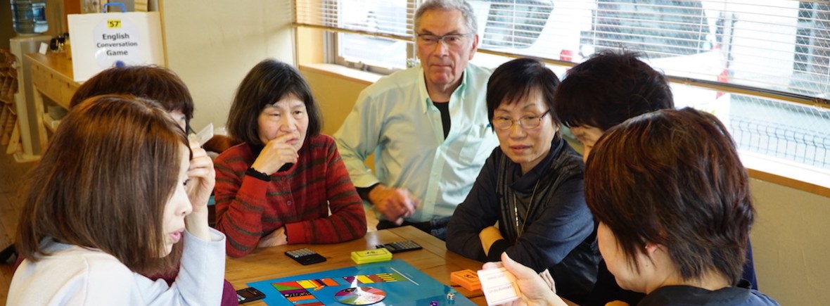 This is my ’57’ English conversation game which took four years and lots of trials (with students) to develop. The game uses 57 squares of eight different colors with dice, tokens, calculators, and six different sets of flashcards and allows students to play independently once they “learn the ropes”.